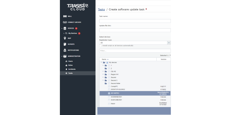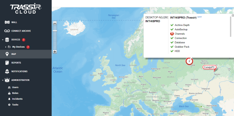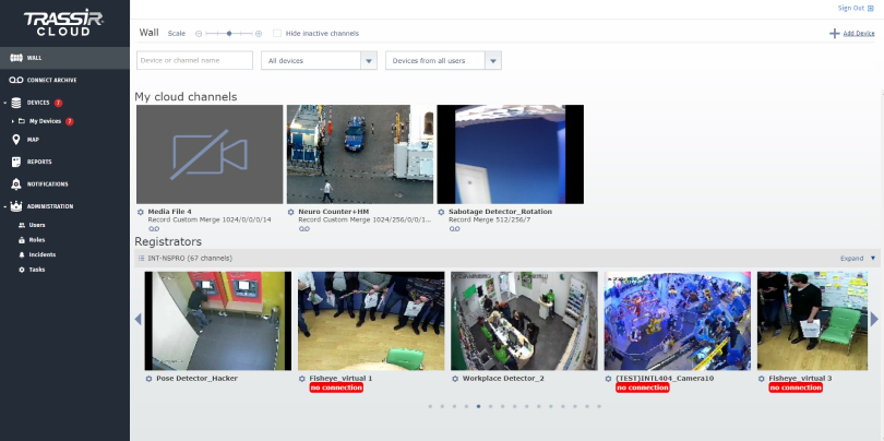 La interfaz CMS actúa como complemento de la interfaz de videovigilancia profesional TRASSIR VMS (TRASSIR Client y TRASSIR Server).