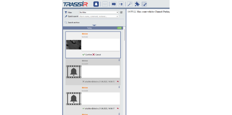 Las alarmas se muestran instantáneamente en la interfaz TRASSIR y requieren la confirmación o cancelación del operador.