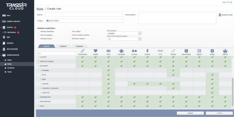 Desde el CMS, se puede gestionar fácilmente a los usuarios, otorgándoles derechos y roles (un conjunto de derechos). En CMS se puede introducir su sistema de usuarios corporativo a través de LDAP. Los usuarios podrán acceder al software de videovigilancia TRASSIR con sus nombres de usuario y contraseñas corporativos habituales.