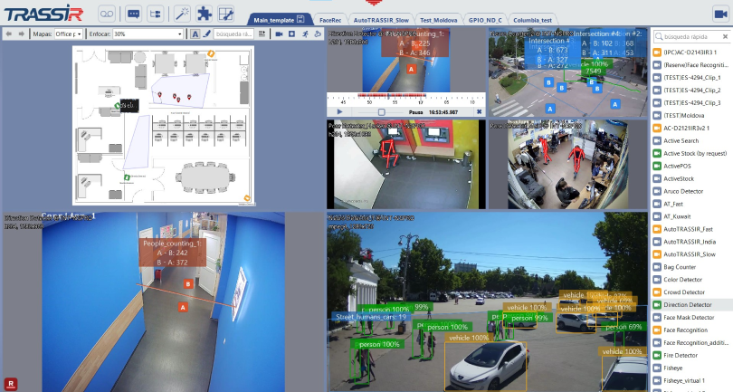 TRASSIR VMS cuenta con todos los módulos de analítica de vídeo necesarios: reconocimiento facial, reconocimiento de matrículas, de objetos, de ropa, de poses; analítica de caja, analítica de almacén; detección de movimiento, detección de dirección, detección de dimensiones; mapas de calor y mucho más.